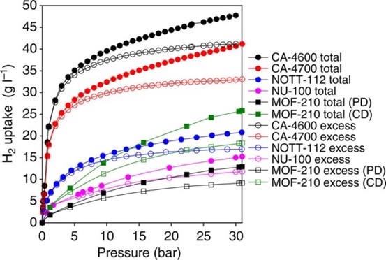 活性碳(CA-4600和CA-4700)以及典型金属有机骨架材料(NOTT-112、NU-100、MOF-210)的储氢体积分数。其中PD指堆积密度,CD指结晶密度。