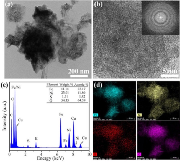 (d)相应元素图谱Fe(紫色), Ni (黄色), S (光色),O (绿色);