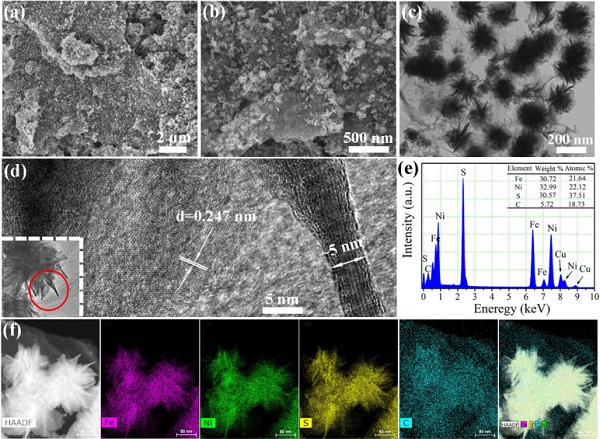 (f-j) HAADF图和相应的元素图Fe (purple), Ni(绿色), S (黄色), C (蓝绿色) 以及产品中所有元素的混合和匹配;