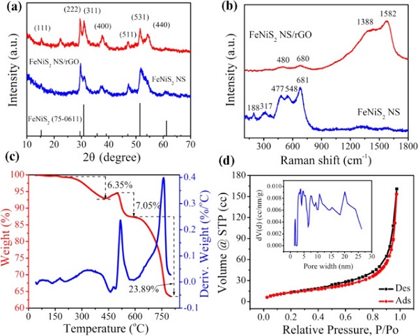 (c-d) TGA曲线and FeNiS2 NS/rGO的氮的吸附等温线与对应的孔隙大小分布曲线;