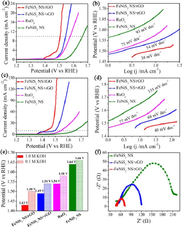 (c-d)在1M KOH溶液中FeNiS2 NS/rGO, FeNiS2 NS+rGO, RuO2,FeNiS2 NS的LSV曲线以及相应的塔菲尔斜率曲线;