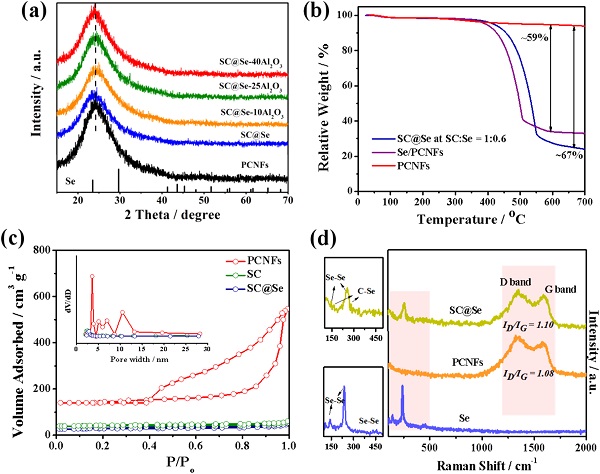 (a) Se, PCNFs和SC@Se-xAl2O3复合材料 (x=10, 25, 40)的XRD图谱;