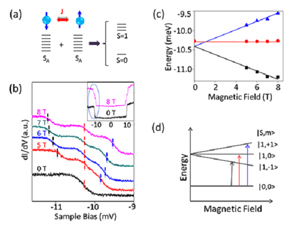 (b)锰二聚体的自旋激发谱,显示零场(0 T)下的自旋激发台阶在磁场(5, 6, 7 和8 T)下发生三重劈裂。