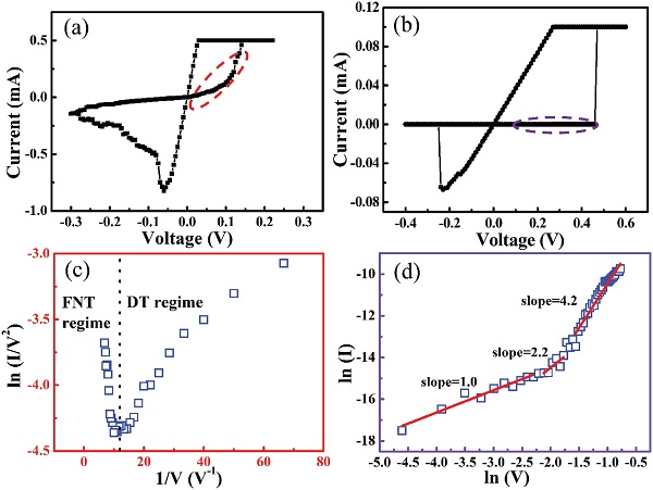 (c)图(a)中红色部分的I-V曲线可拟合为隧穿机制;