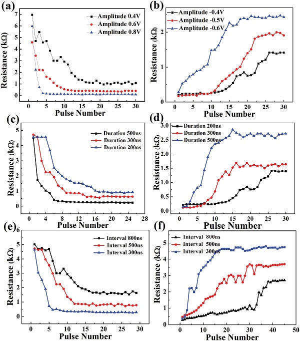 (e-f)正/负脉冲间隔对电导调制的影响。