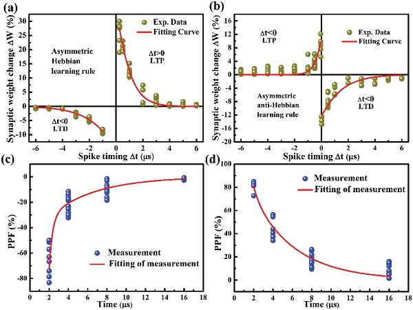 近日,河北大学闫小兵副教授、中科院微电子所刘琦研究员、新加坡国立大学刘向阳教授(共同通讯作者)等人在Adv. Funct. Mater.发表了题为“Memristor with Ag-Cluster-Doped TiO2 Films as Artificial Synapse for Neuroinspired Computing”的研究论文,报道了一种自组装Ag团簇梯度掺杂的TiO2(Ag/TiO2:Ag/Pt)膜,能够大大提升忆阻器电阻缓变的性能。所制备的忆阻器能够模拟生物突触的激活和抑制过程,例如在正/负脉冲下表现出逐渐增强/降低的电导。而且,该器件能够成功模仿生物突触的学习和计算功能,例如短时记忆(STM)向长时记忆(LTM)的转变、长时增强和降低(LTP和LTD)、尖峰时间相关的突触可塑性(STDP)和双脉冲易化(PPF)。施加的几百纳秒脉宽的脉冲实现器件的学习工程,意味着器件具备非常快的学习和计算速度。上述结果显示,Ag团簇掺杂的氧化物具有模仿生物突触行为的潜力,对进一步制备人工神经系统意义非凡。