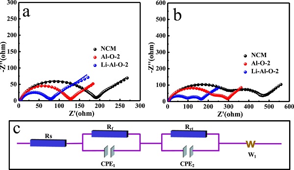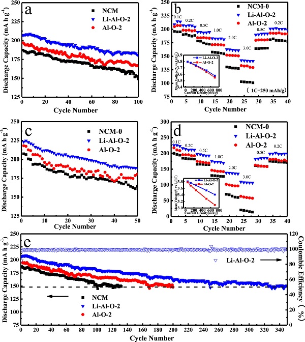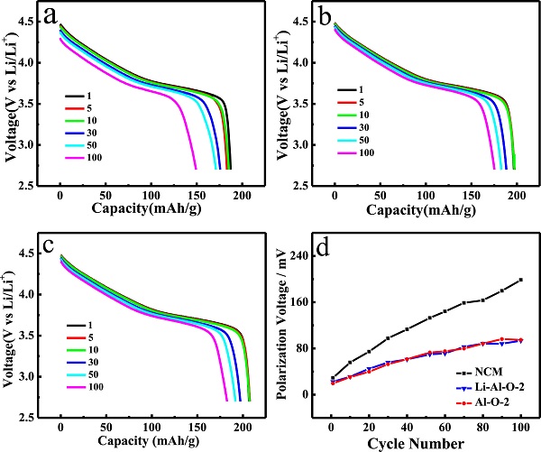 (a) 电压范围为2.7–4.5V vs.Li/Li+,在0.2C(50mA g-1)速率的条件下NCM,Al-O-2和Li-Al-O-2的循环性能;