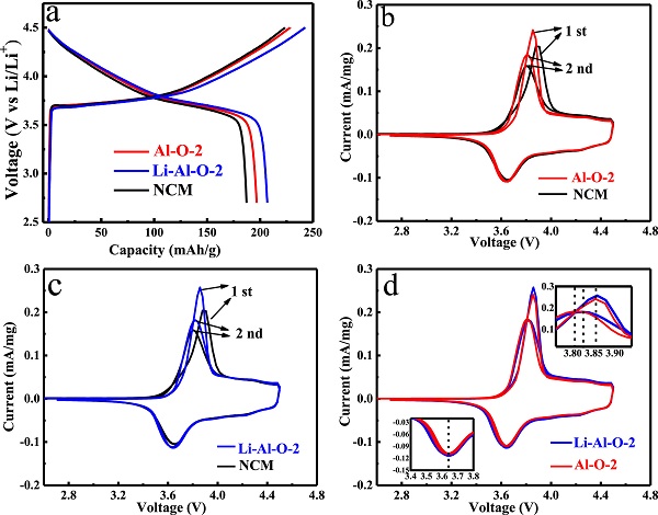 (a)NCM,Al-O-2和Li-Al-O-2的初始充放电曲线;