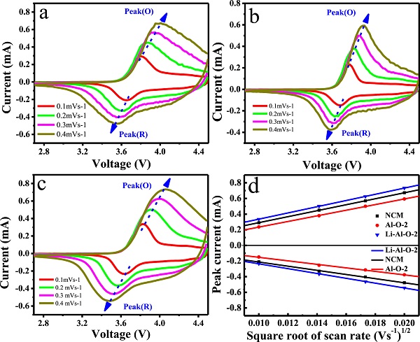 (a,b,c)NCM,Al-O-2和Li-Al-O-2在不同扫描速率下的电流电压曲线;