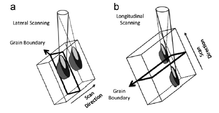 那么导致衍射花样重叠的原因是什么呢?答案就是EBSD采集的背散射电子的产生范围,或是我们常说的电子束与样品的作用体积。如下图2所示,当电子束扫描过一条晶界时,其两侧的作用体积有重叠才最终导致无法标定取向。有意思的是我们在做EBSD测试时,样品是倾斜了70度的,所以严格的讲,EBSD的空间分辨率严格上说应该有两个,一个是水平方向扫描的分辨率;一个是垂直方向扫描的分辨率,而且前者应该优于后者。