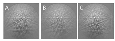 选取一条孪晶界,在其两侧等距离采集多副衍射花样,即图3中的B(B1,B2,B3..),同时在晶界最左和最右远离晶界处采集两幅参比花样,即图3中的A和C。然后采用像素相关公式计算所有的B与A、C的相关系数,