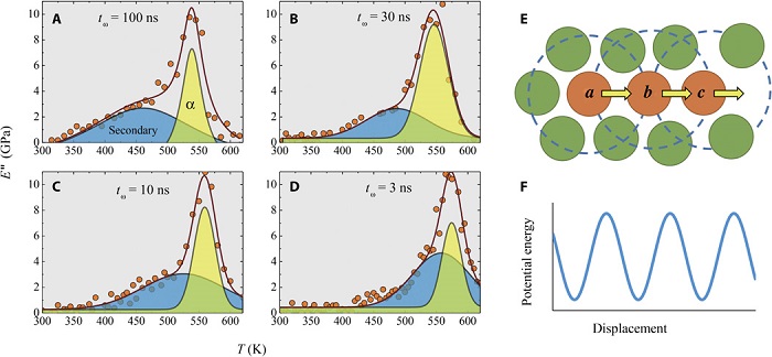 (A-D)Ni80P20非晶合金在测试周期分别为100ns(A),30ns(B),10ns(C),3ns(D)时的损耗模量E”;