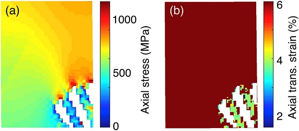 (b)根据DIC测量的总应变和ff-HEDM测量的B2和B19,中的晶格应变,计算得到峰值载荷下的相变应变分布,εtrans=εtotal-εlatticeB2– εlatticeB19,。