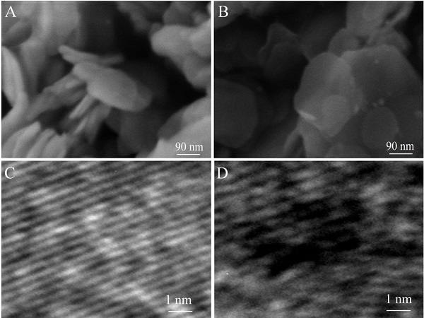 (A)体相CoFe LDHs纳米片的SEM图;(B)超薄N-CoFe LDHs纳米片的SEM图;(C)体相CoFe LDHs纳米片的HRTEM图;(D)超薄N-CoFe LDHs纳米片的HRTEM图;