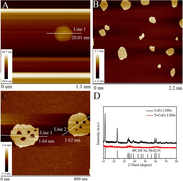 (A)体相CoFe LDHs纳米片的AFM图;(B、C)超薄N-CoFe LDHs的AFM图;(D)体相CoFe LDHs纳米片和超薄N-CoFe LDHs纳米片XRD图;