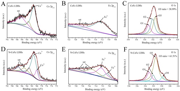 样品CoFe LDHs的XPS图. (A)Co2p3/2;(B)Fe2p3/2;(C)O1s; 超薄N-CoFe LDHs的XPS图.(D)Co2p3/2;(E)Fe2p3/2;(F)O1s;