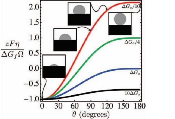 从上面这张图可以看出,当接触角越小,体相吉布斯自由能越大,所需要的临界过电势就越小,换言之,沉积的过程就越容易进行。
