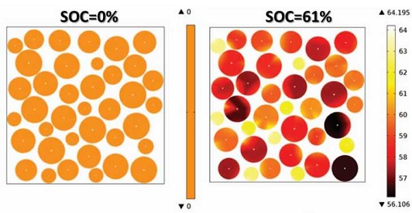 对于石墨而言,在不同充电深度上,锂离子的浓度分布十分不均匀,这也为锂枝晶的成长提供了可能: