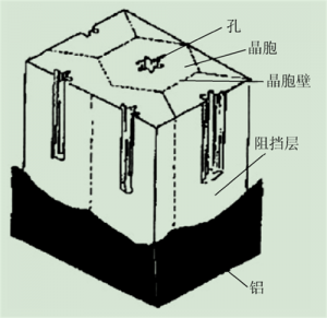 对于多孔阳极氧化膜的结构,最早的模型的是由Kellar 1953年提出的。Kellar 认为阳极氧化膜由两层组成,其中与基体结合的膜层为阻挡层,它是无孔致密的;阻挡层上面的膜层称为多孔层,由许多六角柱形的结构单元组成,如图1所示。Keller 模型的星形孔洞形态目前已被修正为圆形,但他们提出结构单元为六边柱体的观点在今天仍然具有参考价值。