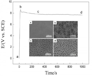 在反应初期阶段,电压随着时间急剧增加到最大值,铝表面形成一层致密的氧化膜,这层氧化膜称为阻挡层。阻挡层具有较高的电阻,阻碍反应的进行。阻挡层越厚,膜电阻越大。此时阳极主要发生的反应分为膜的生成反应(2Al+3H2O-6e–→Al2O3+6H+)和膜的溶解反应(2Al+6H+→Al3++3H2和Al2O3+6H+→2Al+3H2O)。这时膜的生成速度远远大于膜的溶解速度,故阻挡层厚度逐渐增加。由于电流恒定以及单位厚度的阻挡层的电阻一定,故形成电压逐渐升高。