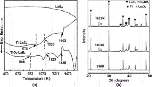 (a)LaB6粉末,摩尔比为1:1的Ti-LaB6和TiO2-LaB6 粉末混合物在加热到1623 K(1350 ℃)过程中,加热速度为10 ℃/ min时的DSC曲线;