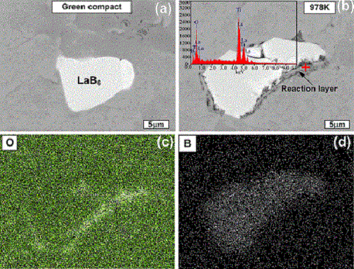 (a)Ti-1.0 LaB6压坯中LaB6颗粒的背散射电子图像(BSE);(b)加热到978 K(705 ℃)后LaB6颗粒的背散射电子图像;(c)和(d)是(b)中显示的微结构的O,B的EDS 面扫结果。