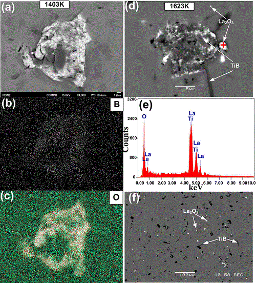 (a)加热到1403 K(1130 ℃)Ti-1.0 LaB6样品中LaB6颗粒的背散射电子(BSE)图像;