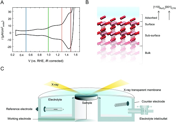 (A)50 mV s-1的扫描速率下,在Ar饱和的0.1M HClO4溶液(~pH 1.2)中测量的RuO2 (110)单晶表面的循环伏安曲线。0.5 V,1.0 V,1.3 V和1.5 VRHE的垂直线表示进行表面衍射测量的电位。