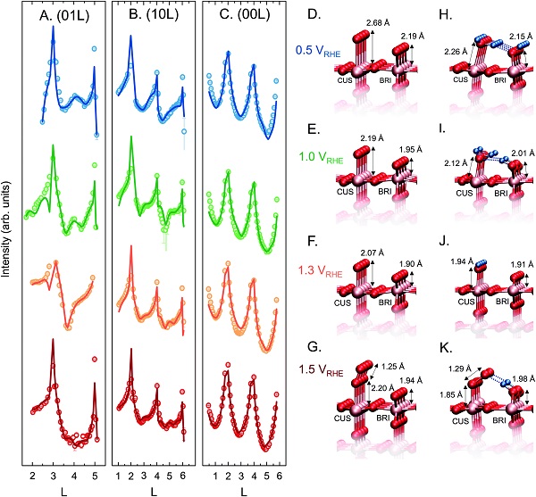 (D)0.5 VRHE,(E)1.0 VRHE,(F)1.3 VRHE和(G)1.5 VRHE为最佳拟合结构的球杆模型得到的晶体截断杆数据。键长的最大实验不确定度为0.06,每个键长的详细不确定度在图S12(ESI†)中。