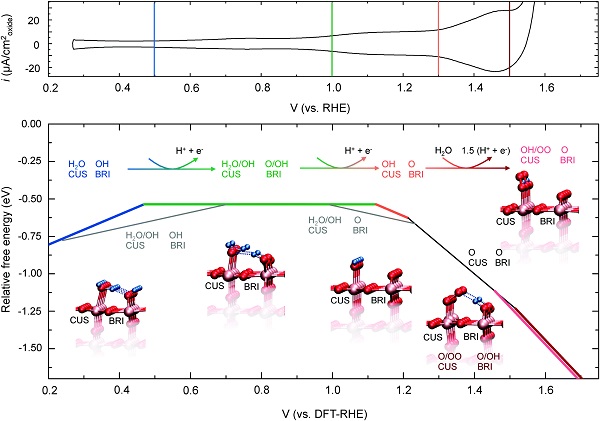 上图和下图的x轴分别显示了循环伏安曲线(黑色)的应用电位和计算的DFT电位与RHE(VDFT-RHE)的关系。每个电压下最稳定的晶面以粗线显示,其构型与所标注的线相对应。粉红色,红色和蓝色球分别代表Ru,O和H原子,氢键在相应处用蓝色虚线画出。