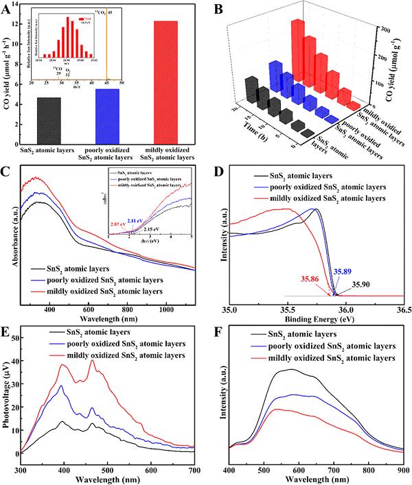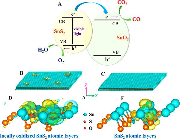 适度氧化的SnS2原子层的光还原CO2机理示意图。