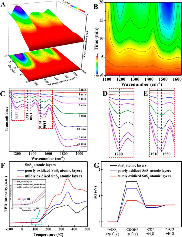 研究人员首次制备出具有不同氧化度的金属硫化物原子层,力证局部氧化位点对于金属硫化物光还原CO2性能提升的重要性。进而以SnS2为例,利用SPV和PL光谱证实氧化锡位点有助于载流子分离动力学提升,而原位FTIR光谱结果充分表明COOH*自由基是光还原CO2过程的主要中间体。更重要的是,DFT计算发现COOH*的形成是决速步,而定域于锡原子的电子使得局部氧化位点可以通过稳定COOH*中间体降低CO2活化能势垒。简而言之,该工作从实验/理论上证明了局部氧化区域可以作为高催化活性位点,不仅提升电荷分离效率也有利于CO2活化,为实现稳健的太阳能驱动CO2转换开辟新途径。