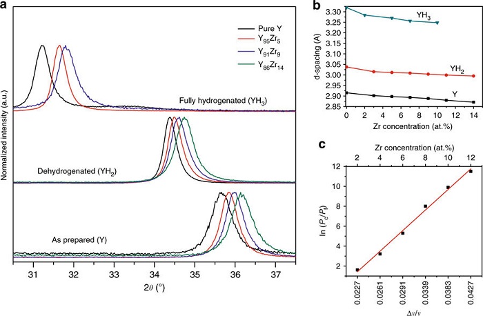 (b)作为Zr浓度函数的YHx的d-间距的改变,分别对应完全制备态、完全氢化态(YH3)和脱氢态(YH2);