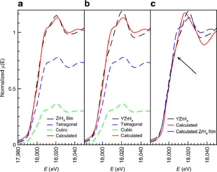 图4. 在氢化的Zr和YZr薄膜上进行XANES模拟