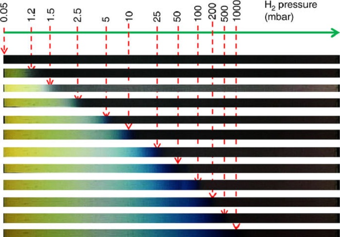 近期,荷兰乌得勒支大学Peter Ngene研究员等人(通讯作者)研制了一种能通过颜色改变来检测氢气浓度的传感器。该研究通过向钇中加入少量的锆导致钇晶格的收缩,使得YH2↔YH3的平衡氢气浓度可以在五个数量级的范围内被有效地被调控,而成功制备了一个可以产生肉眼可辩的颜色变化来检测氢气的氢气传感器,它能有效地检测四个数量级的氢气浓度。相关成果以“Metal-hydrogen systems with an exceptionally large and tunable thermodynamic destabilization”为题发表在了Nature Communications上。