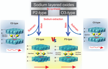 图1层状钠氧化物(NaMeO2)分类,不同层状结构钠离子脱出和迁移诱导电化学相变