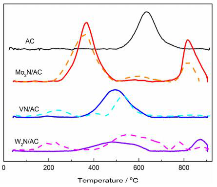 图4 过渡金属氮化物(MxNy)催化剂的TPR曲线与乙炔转化率(Journal of Industrial and Engineering Chemistry, DOI: 10.1016/j.jiec.2017.01.031)。