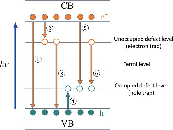 光激发后,导带(CB)中的电子可以直接与价带(VB)中的空穴复合①。一部分光激发电子可以被未占据的缺陷能级(电子陷阱态)所捕获②。捕获之后,电子可以与VB空穴发生复合③。类似地,空穴可以被占据的缺陷能级(空穴陷阱态)俘获,然后与CB电子⑤或被俘获的电子⑥复合。橙色表示电子,翠绿色表示空穴。
