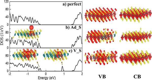 (a)、(b)和(c)分别为完美的单层MoS2、Ad_S和V_S的态密度(左图)和电荷密度(右图和插图)。插图显示缺陷态的电荷密度。右侧显示能带边缘的电荷密度。Ad_S在VB边缘有浅局域空穴陷阱状态。V_S有两个陷阱态:靠近VB边缘的浅空穴陷阱态和在CB边缘以下0.6 eV的深能级定域电子陷阱态。VB边缘的电荷密度受到缺陷的强烈干扰,而CB边缘状态保持不变。
