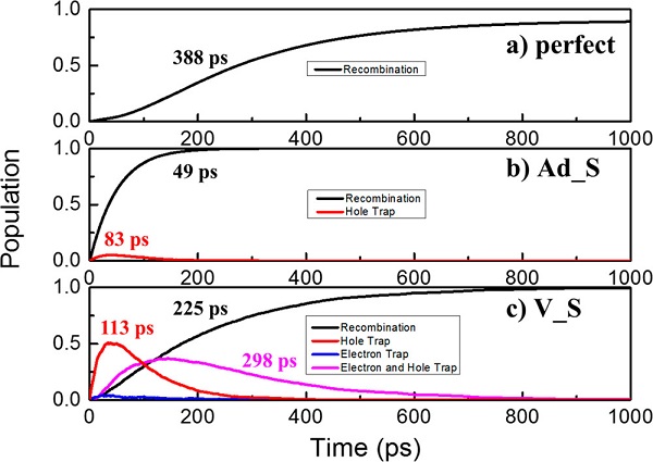 (a)、(b)和(c)分别为完美的单层MoS2、Ad_S和V_S的载流子俘获和复合动力学。电子-空穴复合用黑线表示(图1中的过程①)。空穴俘获和空穴陷阱协助的复合以红色表示(图1中的过程④和⑤)。电子俘获和电子陷阱协助的复合以蓝色表示(图1中的过程②和③)。通过电子和空穴同步俘获的复合以紫色表示(图1中的过程②+④和⑥)。