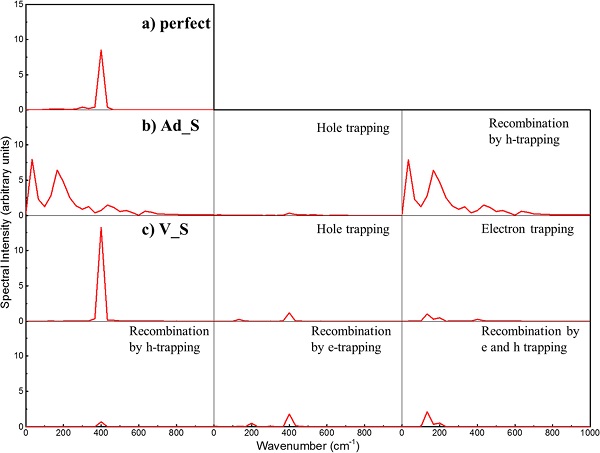 (a)、(b)和(c)分别为完美的单层MoS2、Ad_S和V_S(三、四行)中载流子动力学涉及的声子模式。峰高表征电声耦合的强度。S吸附原子允许多种声子模式与载流子耦合,加快复合(图4)。