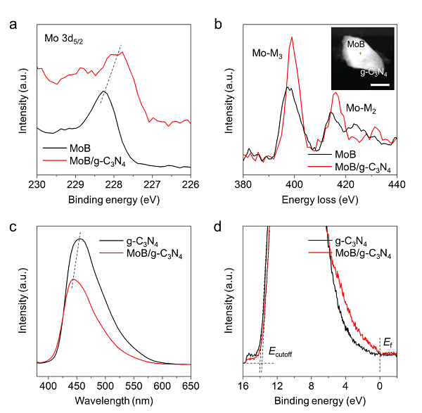(c,d)(c)g-C3N4及MoB/g-C3N4的PL及(d)UPS