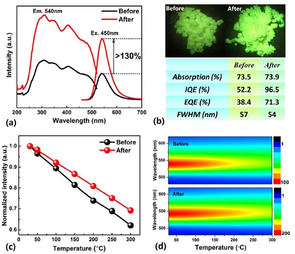 本文报道了一种显著提高β-Sialon:Eu2+绿粉量子效率的热处理方法。通过在还原气氛中长时间退火,荧光颗粒的发光强度提高2.3倍,量子效率从52.2%提高至96.5%。化学分析表明荧光粉发光性能提升主要归因于:(1)表面Eu3+被还原为Eu2+;(2) 还原后更多Eu2+进入晶格。本工作的结果为高流明效率、高亮度LED背光源的获得提供了优异的窄带绿粉。