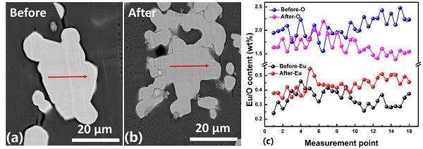 (c)颗粒截面Eu/O的元素线扫描结果。