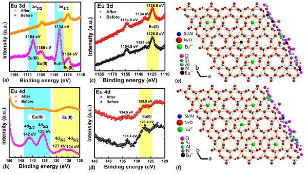 (e-f)分别为β-Sialon:Eu2+粉体处理前、后Eu的分布示意图。