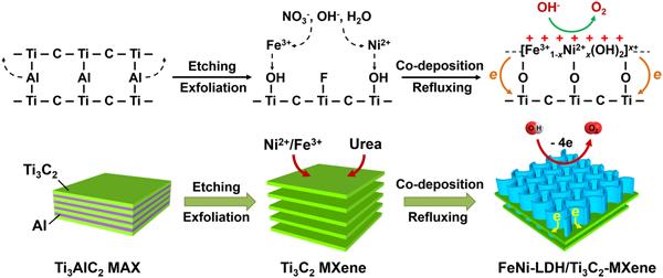 制备的Fe/Ni-LDH/Ti3C2-MXene纳米复合材料能够提供协同化学和电子耦合作用,从而能够提高纳米材料的催化析氧性能。(Etching:刻蚀作用,Exfoliation:剥离,Co-deposition:共沉淀,Refluxing:冷却回流)