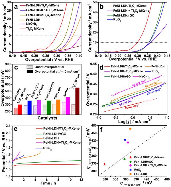 (c)不同催化剂FeNi-LDH/Ti3C2-MXene、FeNi-LDH+Ti3C2-MXene、FeNi-LDH/rGO、FeNi-LDH、Ni(OH)2、RuO2和Ti3C2 MXene在出现过电压和电流密度为10 mA cm-2时过电压结果;
