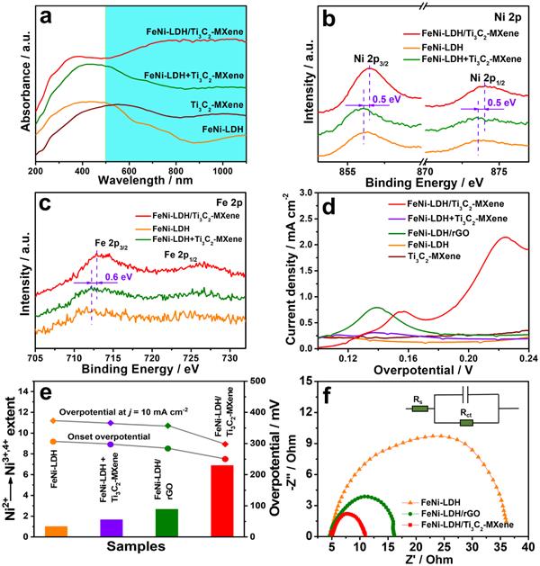 (a)FeNi-LDH/Ti3C2-MXene、FeNi-LDH+Ti3C2-MXene、FeNi-LDH和Ti3C2 MXene催化剂的紫外-可见吸收光谱结果;