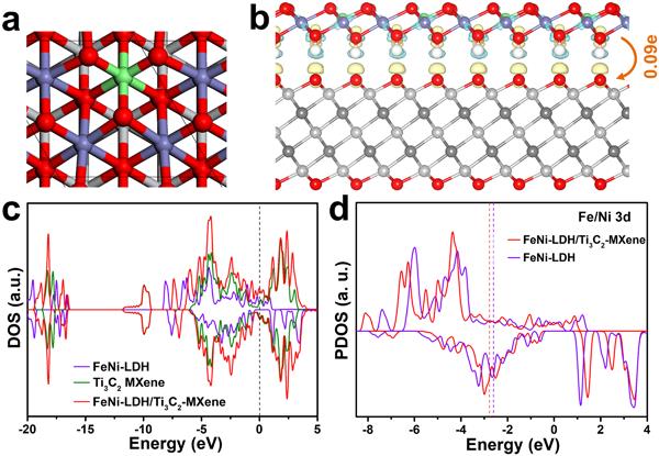 (d)层状FeNi-LDH/Ti3C2-MXene和FeNi-LDH中Ni/Fe 3d轨道的投影态密度结果。