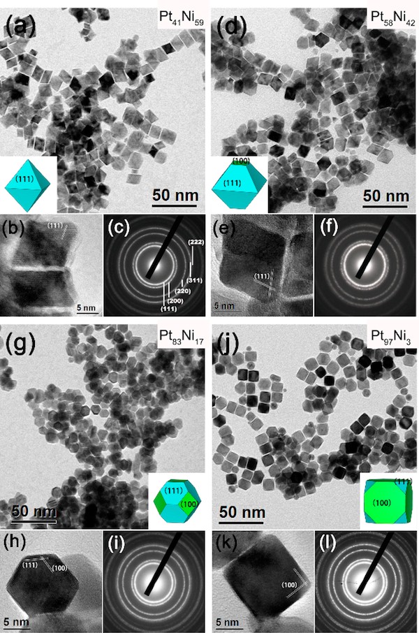 (a、d、g、j) 分别为Pt41Ni59、Pt58Ni42、Pt83Ni17、Pt97Ni3的TEM图像。